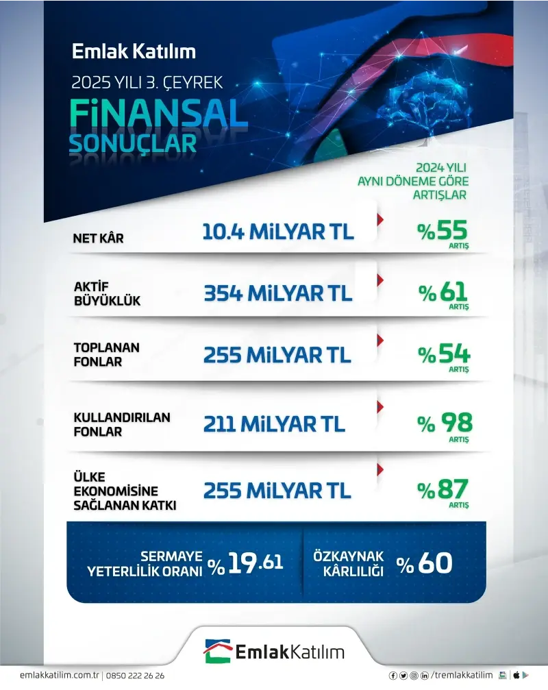 Bu dönemde, geçen yılın aynı dönemine göre yüzde 87 artışla Türkiye ekonomisine 255 milyar lira kaynak sağlayan Emlak Katılım, net karını yüzde 55 oranında artırarak 10,4 milyar liraya çıkardı.